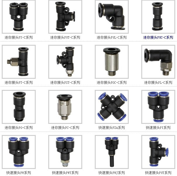 四、氣動輔助元件/Accessories:1、快速接頭系列2、迷你接頭系列3、迷你金屬接頭系列4、節流閥系列5消音器系列
