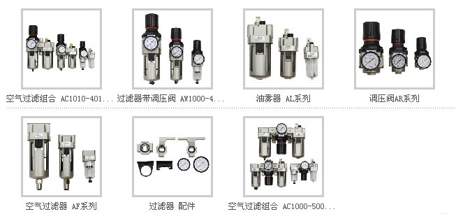 三、氣源處理元件:A系列:三聯件系列F.R.L AC2000~5000;二聯件AC2010~5010;Air Filter空氣過濾器系列AF2000~5000;Lubricator油霧器系列AL2000~5000;Filter+Regulator調壓過濾器AW2000~5000;Regulator調壓閥系列AR2000~4000;B系列:三聯件GNAC2000~5000;兩聯件:GNAC2010~5010;調壓過濾器:GNAW2000~5000;調壓閥:GAR2000~5000;